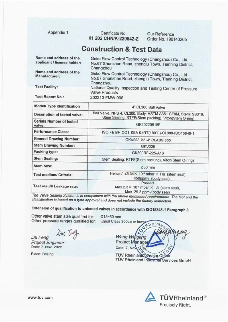 Компания Geko Valves & Controls получила сертификат ISO15848 на низкую утечку при утечке шаровых кранов, выданный компанией TUV Rheinland в ноябре 2022 года, что свидетельствует о дальнейшем признании эффективности продукции GEKO на международном уровне.